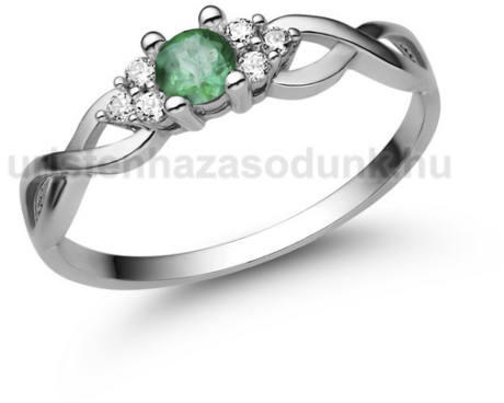 Csavart fazonú, finom eljegyzési gyűrű smaragd kővel középen és 2 darab kísérő gyémánt kővel.