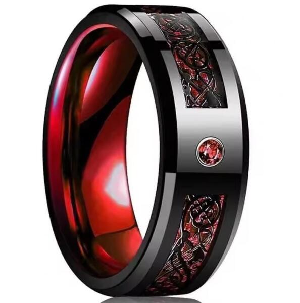 Egyedi gyűrű uraknak, mely kombinálja a modern esztétikát a kelta misztikával. Ezzel egy olyan ékszer keletkezik, ami nem csak vonzza a tekintetet, hanem szimbolikával teli. A gyűrű középső sávja piros színű, kelta szimbólumokkal díszített. A fő díszítőelem a fekete színű fémbe ültetett piros színű cirkónia ékkő, ami fényűző hatást visz a gyűrű kialakításába.