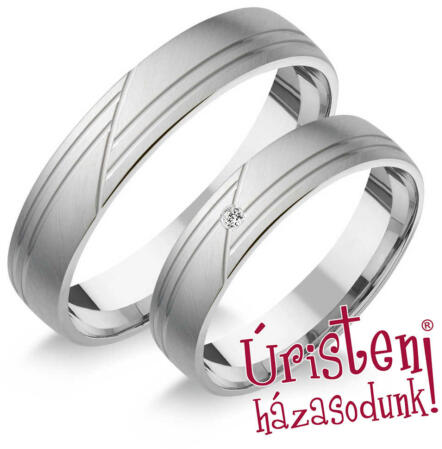 Párhuzamos és aszimmterikus vésésekkel díszített, modern, fehér arany karikagyűrű. A női gyűrű 1 cirkónia kővel díszített.