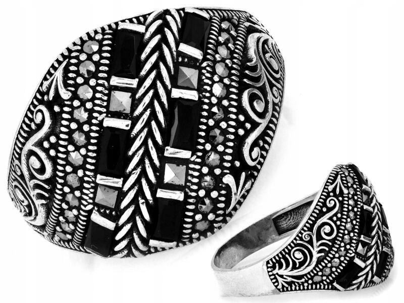 Lovrin Elegáns, nagyméretű, ezüst gyűrű r28 markazitokkal és ónixokkal, 6, 26g ajándékALLEGRO