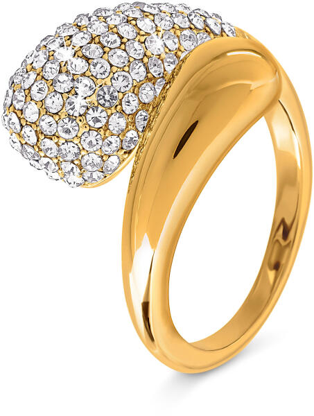 Csepp gyűrű kristályokkal Szín: Aranyszínű Átlátszó üvegkristály kövek Anyag: Sárgaréz Üvegkristály kövek Méretek: Csepp fent: kb. 6,7 mm, lent: kb. 9,1 mm Csepp alakú magába hajló gyűrűÁtlátszó üvegkristály kövekkel berakott