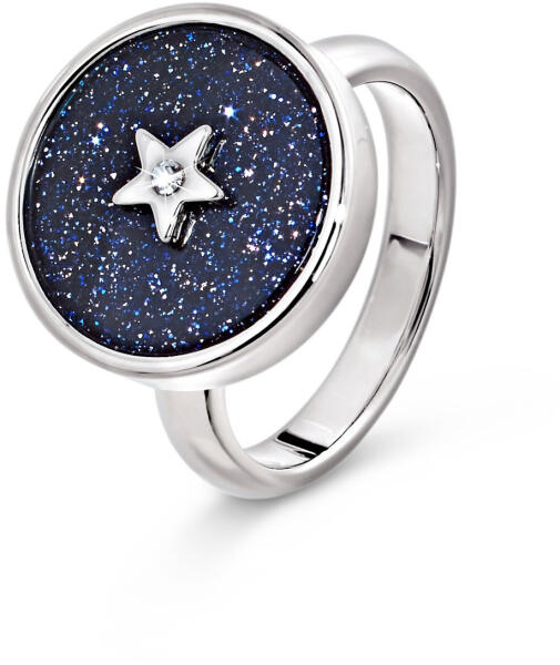 Női gyűrű, Starry Sky Szín: Homokkő: kék Átlátszó üvegkristályok Anyag: Sárgaréz, homokkő és üvegkristály Méretek: Gyűrű szélessége: kb. 2,8 mm Homokkőlapocskák Ø: kb. 16 mm Üvegkristály Ø: kb. 1,3 mm Gyűrű kék homokkővel és kristállyalKék homokkő Üvegkristály