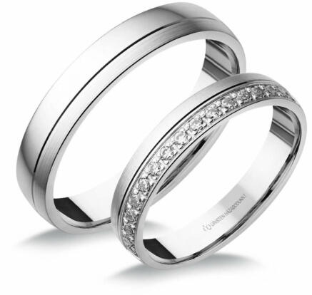 Fehér arany karikagyűrű, vékony véséssel, fényes és matt felülettel, kívül-belül enyhén domború profillal, 4 mm széles sínnel. A női gyűrűt 17 cirkónia kő díszíti.