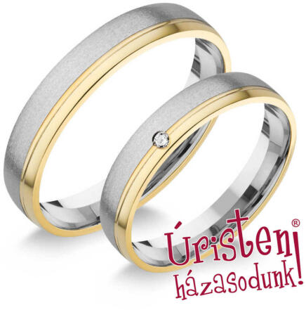 Fehér-sárga arany karikagyűrű, 4 mm széles sínnel, enyhén domború külső-belső profillal, csiszolt, matt fehér arany és fényes felületű sárga arany ötvözetből. A női gyűrű 1 cirkónia kővel díszített.