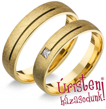 Különleges, sárga arany karikagyűrű, selyemfényű felülettel, enyhén domború külső-belső profillal. A gyűrű pár középen vésett, amit a női gyűrűben 1 cirkónia kő díszít.