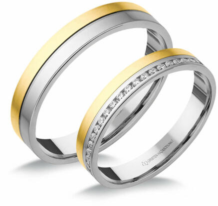 Körbe köves, fehér-sárga arany karikagyűrű, lapos külső-belső profillal, középen vésett, 4 mm széles sínnel, fényes és matt felülettel. A női gyűrűt 23 cirkónia kő díszíti.