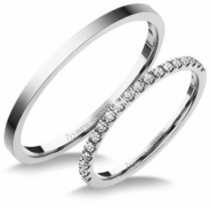 Vékony, klasszikus, fehér arany karikagyűrű. Belül domború, kényelmes viselet, kívül lapos profilú. A női gyűrű gyémánt kövekkel ékítve.